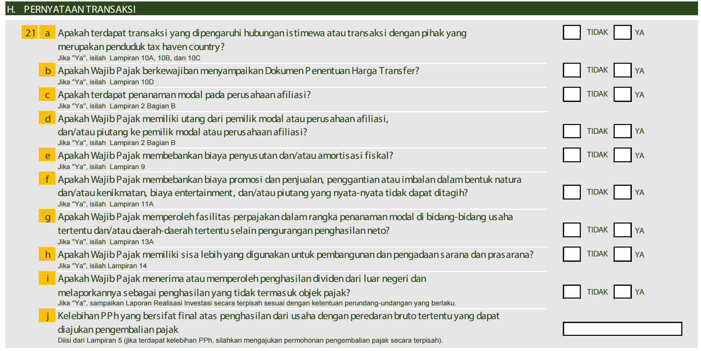 Salah satu inovasi penting dalam Induk SPT adalah ekspansi pada Bagian H: Pernyataan Transaksi. Jika sebelumnya hanya ada dua pernyataan (transaksi hubungan istimewa dan transaksi dengan negara tax haven), kini jumlahnya meningkat menjadi 10 pernyataan transaksi.