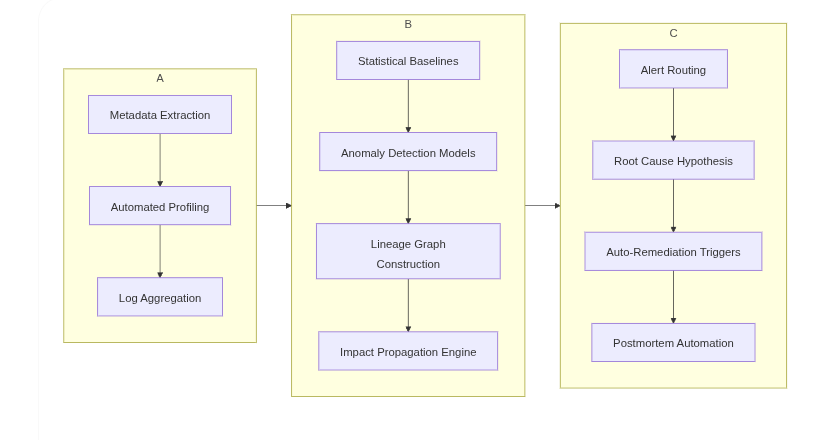 - Pengembangan semantic observability layer, yaitu integrasi business glossary, ontology mapping, dan knowledge graphs ke dalam alur observability untuk memvalidasi makna kolom lintas sistem;