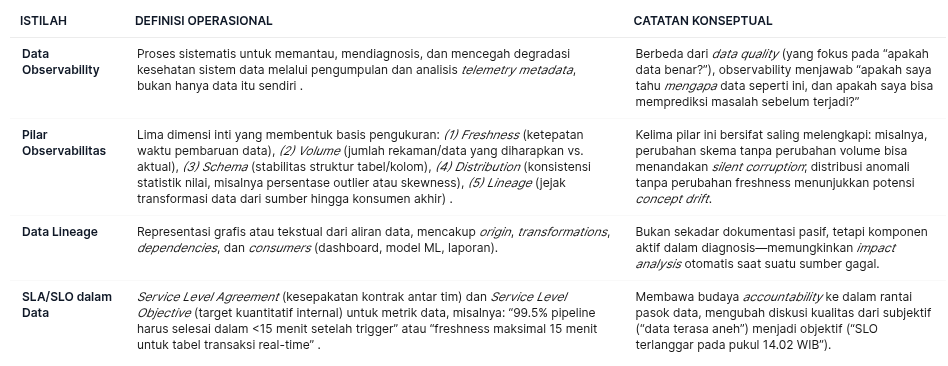Data observability bukan sekadar penambahan lapisan monitoring ke stack dat tetapi sebagai paradigma operasional baru yang menuntut transformasi pada tiga level sekaligus: arsitektur teknis (melalui lima pilar dan siklus tiga tahap), pilihan alat yang strategis (disesuaikan dengan skala, kompleksitas, dan kematangan tim), serta tata kelola organisasi (melalui data contracts, SLO ownership, dan budaya blameless postmortems) . Keberhasilannya tidak diukur dari jumlah alert yang terdeteksi, melainkan dari peningkatan kepercayaan sistematis—baik di antara tim teknis maupun antara tim data dan pemangku kepentingan bisnis. Dalam kata lain, observability yang matang bukan membuat data lebih “terlihat”, tetapi membuatnya lebih dipahami, dipercaya, dan dipakai dengan keyakinan.