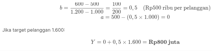 - Pelanggan (X): 1.200 → Pendapatan (Y): Rp600 juta