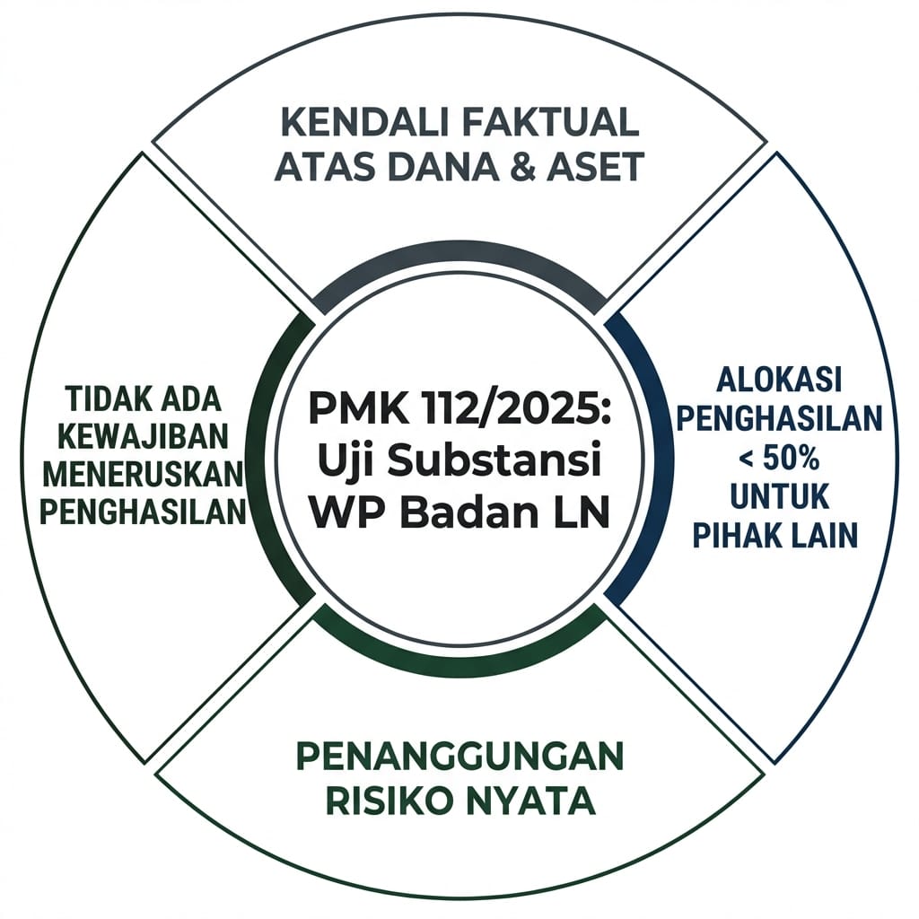 Bagi WP badan luar negeri, PMK 112/2025 menetapkan empat ujian substansial:
